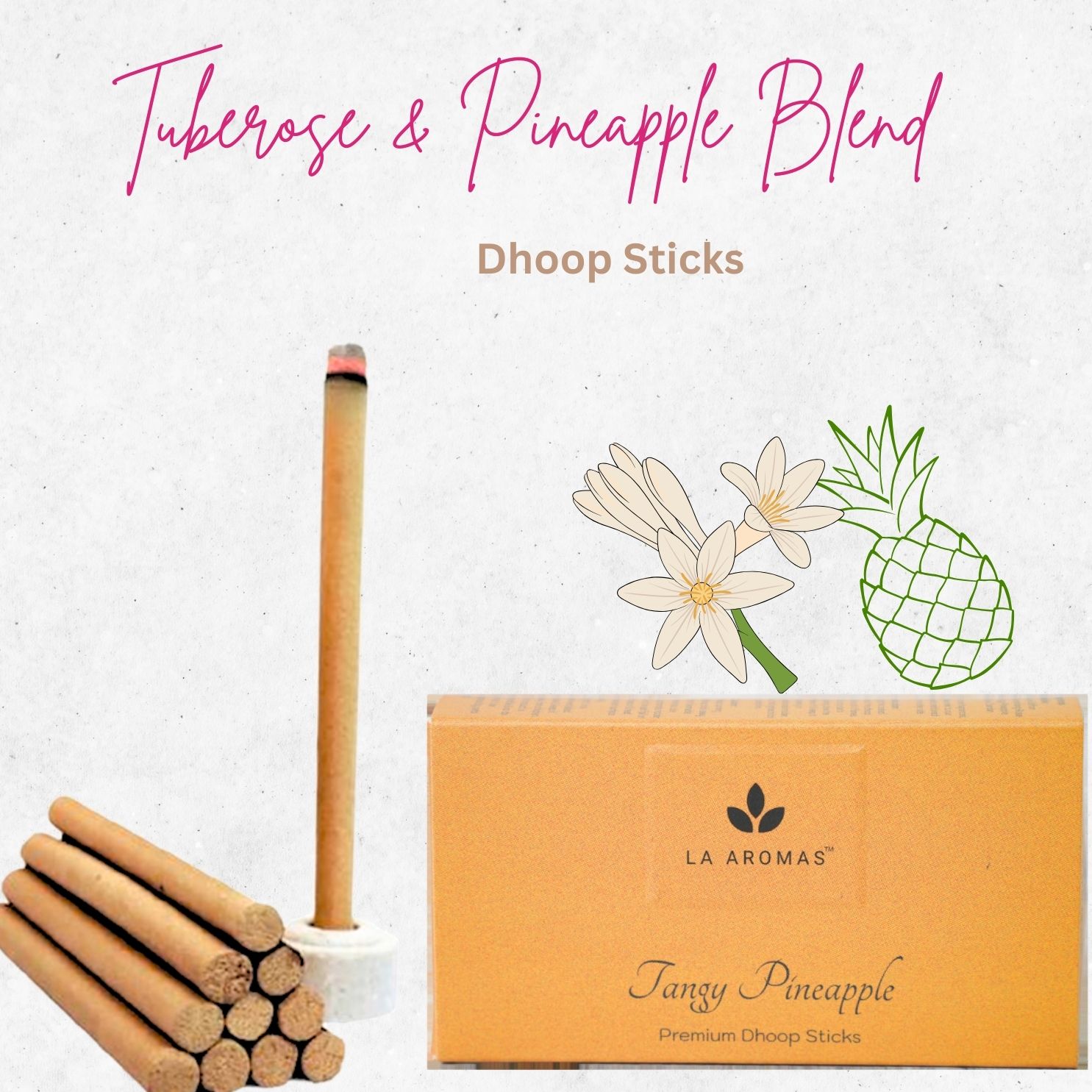Our La Aromas Tangy Pineapple Dhoop Sticks offer a truly modern and invigorating aromatic experience. This vibrant blend combines the sweet, tropical zest of Pineapple with the rich, heady floral notes of Tuberose. It’s designed for those who seek a mood-lifting, energetic fragrance that breaks away from the conventional.